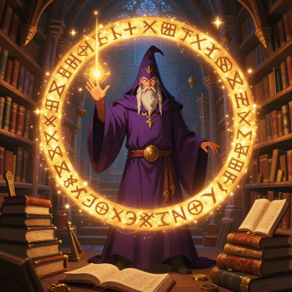 Dnd drawing prompts showcasing a mysterious wizard casting powerful spells in a magical library filled with glowing runes and ancient tomes, high fantasy art, vibrant colors