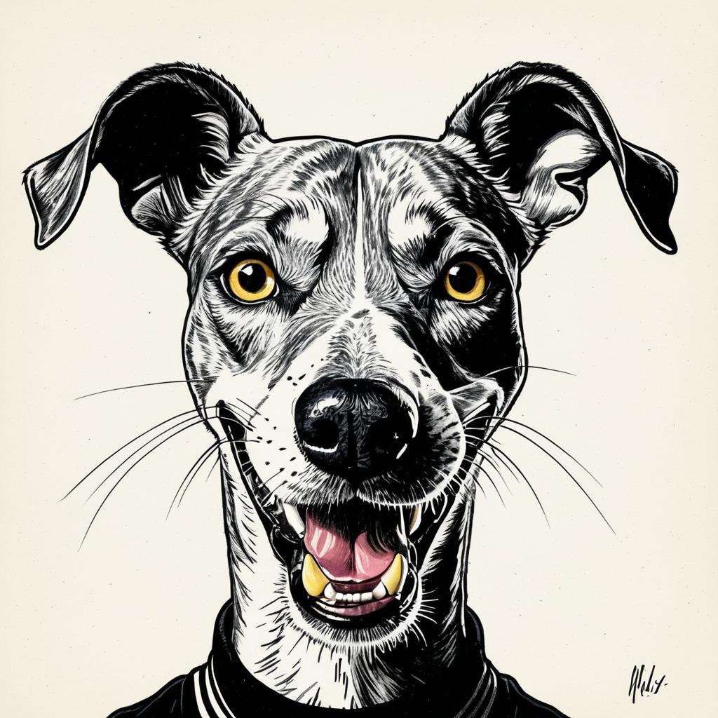 A detailed illustration of a Saint Bernard dog with an oversized head, expressive eyes, and a playful smile. The dog features a mix of white, brown, and black fur, wearing a red collar. The artwork is rendered with a crayon-like texture in a style reminiscent of Jean Dubuffet, emphasizing exaggerated and playful details.