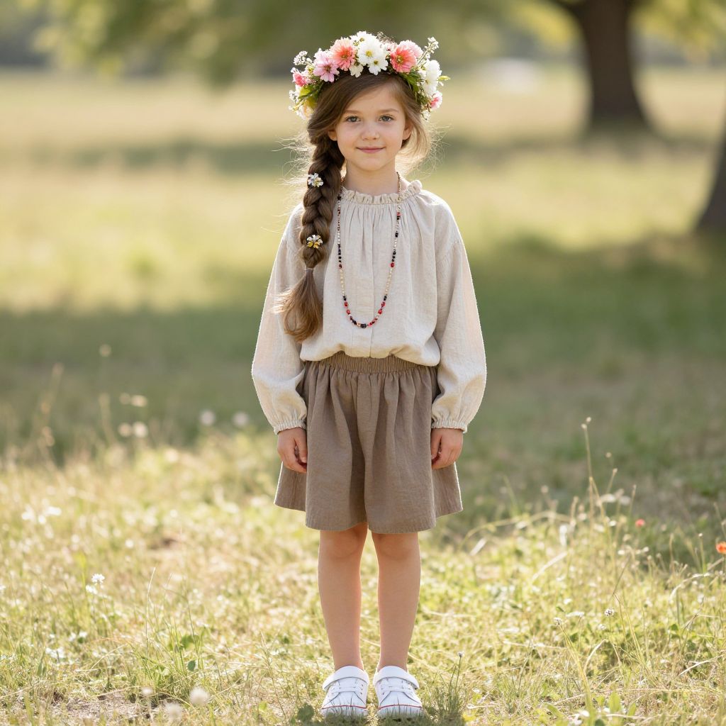AI prompt for kids photoshoot set in a magical forest with enchanted trees and floating bubbles, children dressed in imaginative folk attire, bright natural lighting, and a soft glowing ambiance, emphasizing fun, innocence, and creativity in a fantastical yet accessible environment.