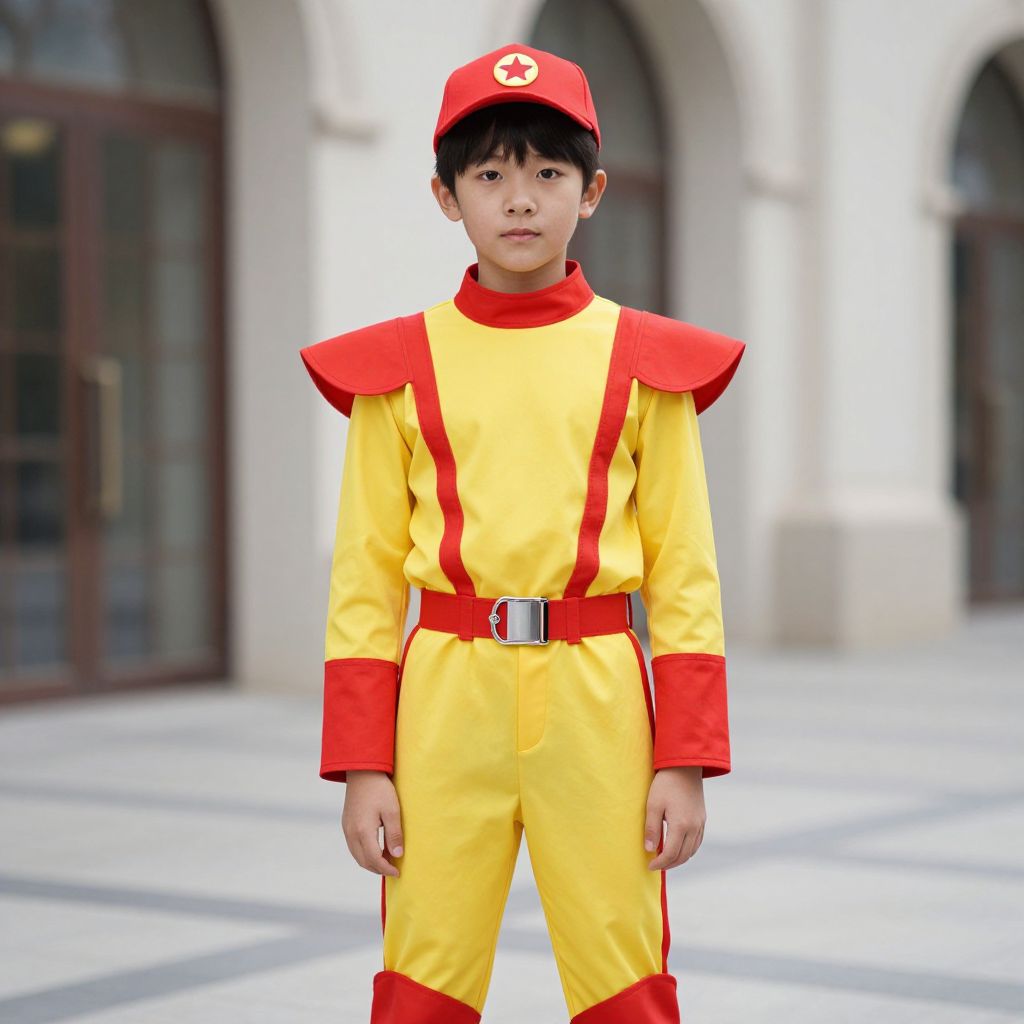 Photograph of an Asian boy standing in an outdoor, arched building courtyard. He wears a bright yellow and red superhero-like costume with red shoulder pads, yellow long sleeves, red cuffs, and red suspenders. He also has a red belt with a silver buckle, red boots, and a matching red cap with a white emblem. The background shows blurred arched windows and doors with a white and gray tiled floor. The boy's expression is neutral, and he stands centered in the frame. The costume has a smooth, slightly shiny texture.
