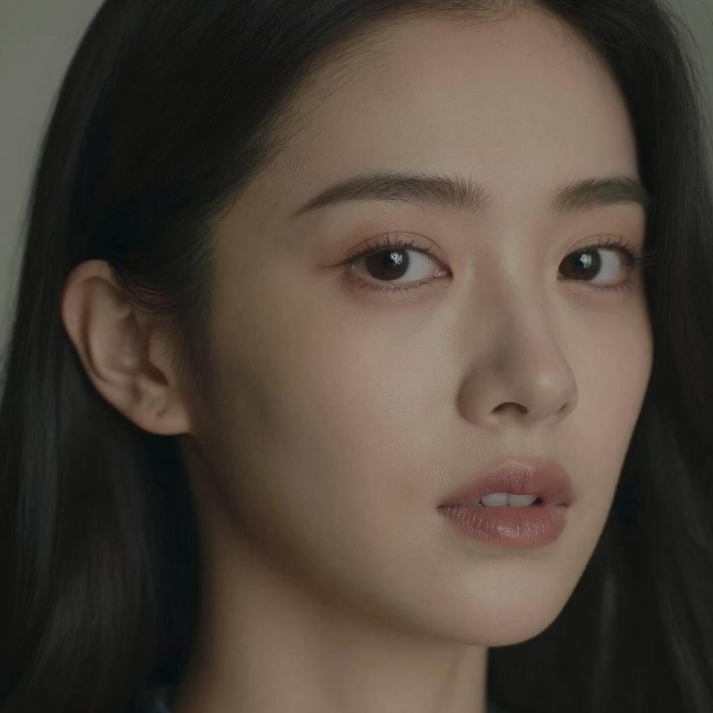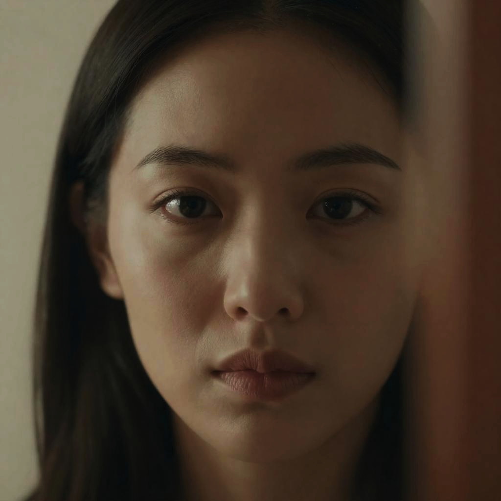 Close-up photograph of a woman with intense gaze, dark eyes, and serious expression. She has long dark hair, slightly parted eyebrows, and is partially obscured by a blurred, vertical striped object on the right. Dim, warm lighting.