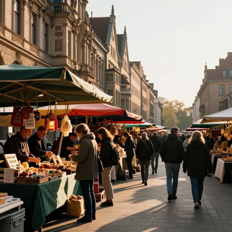Kurzer scene of a bustling European street market at dawn, featuring colorful stalls, people in casual attire shopping and interacting, warm golden sunlight casting soft shadows, intricate architectural details in the background, vibrant and lively atmosphere