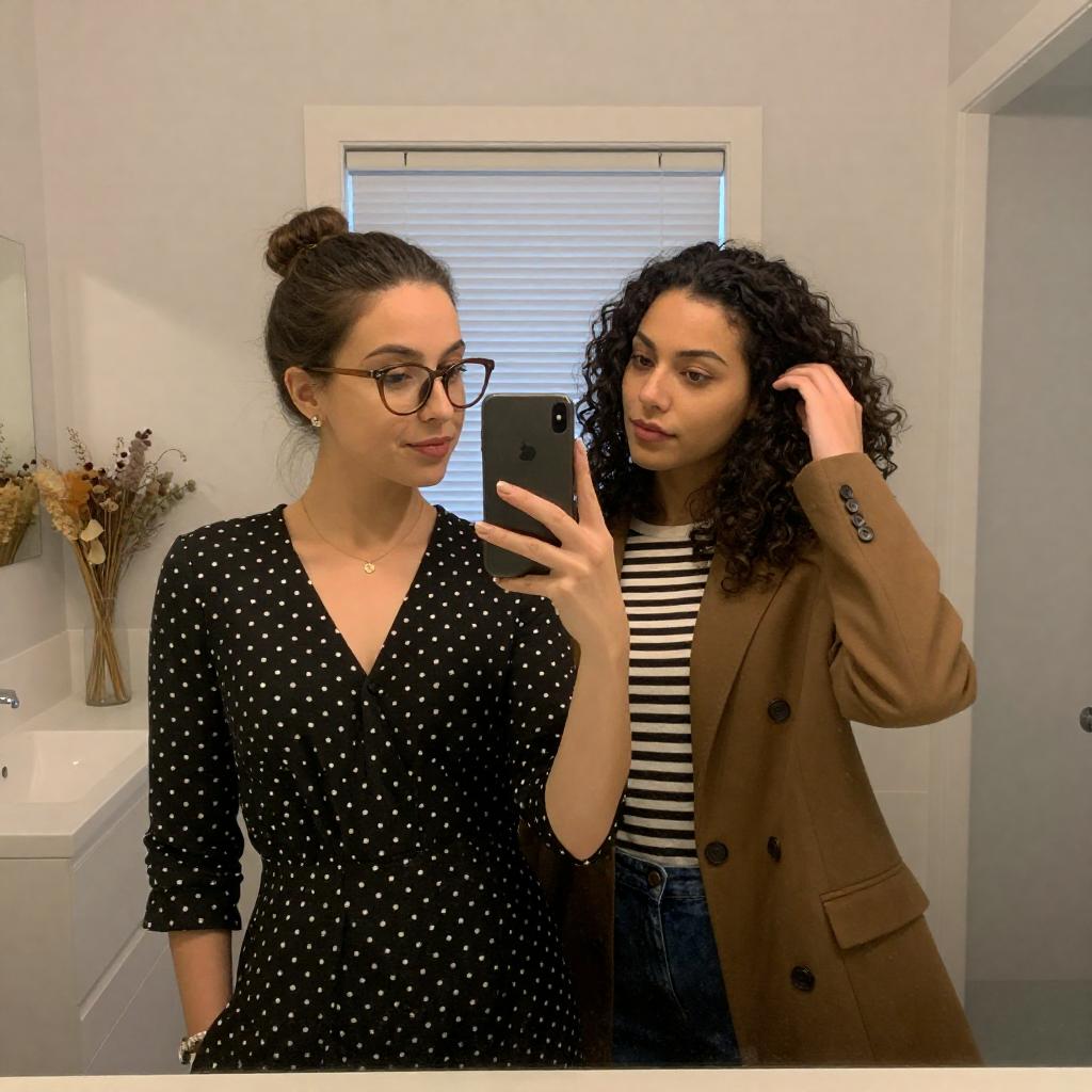 Two young women taking a mirror selfie in a modern bathroom. The woman on the left has dark hair tied in a bun, wears large glasses and a black polka-dot dress with three-quarter sleeves, and is holding a smartphone. The woman on the right has curly dark hair, wears a brown buttoned jacket over a black and white striped shirt, and is adjusting her hair. The bathroom features a white countertop, a mirror, dried flower arrangement in a vase, and a window with closed blinds.