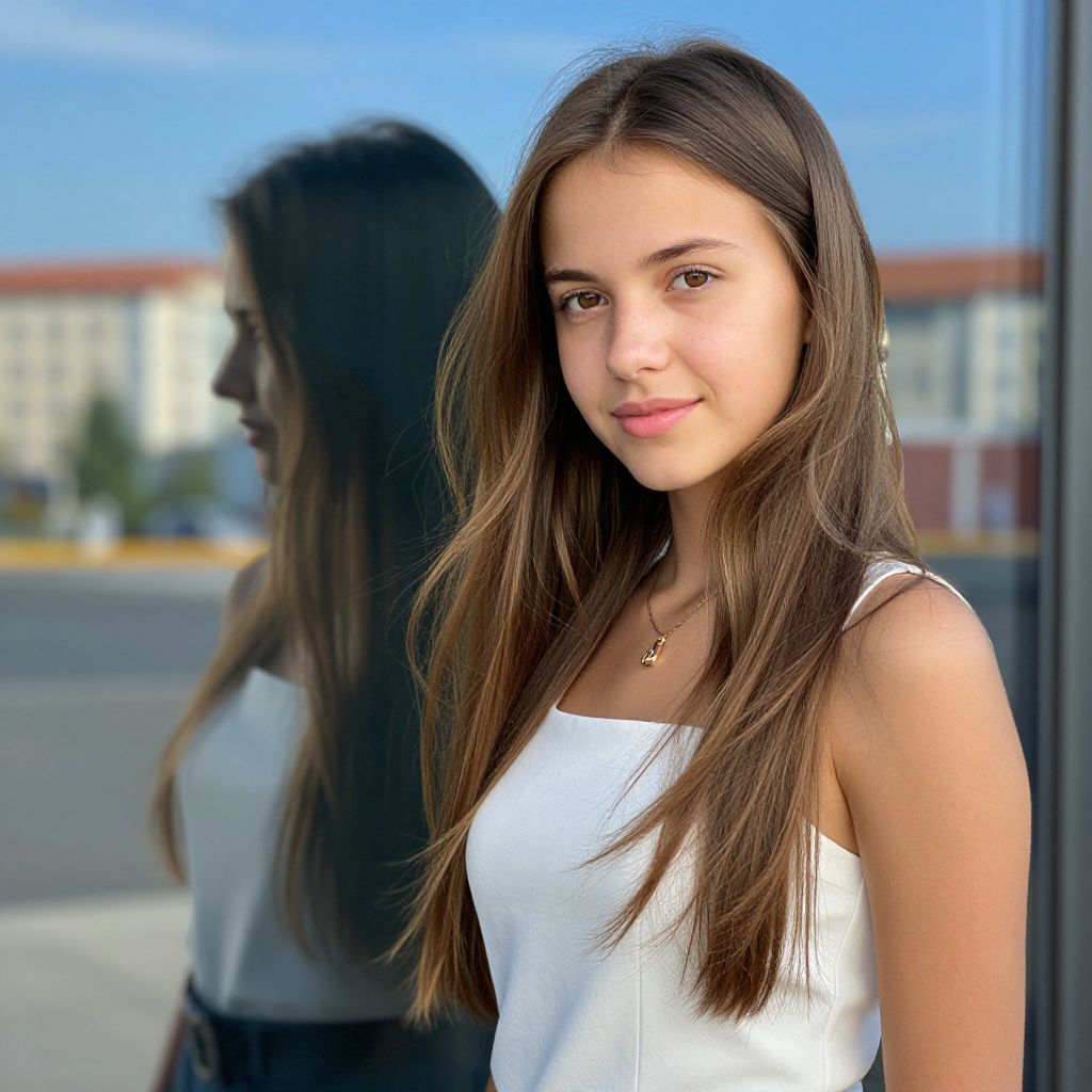 Photograph of a young woman with light olive skin and long, straight brown hair, wearing a white sleeveless top. She has brown eyes, a small nose, and a slight smile. She stands in front of a glass window, with her reflection visible behind her. The background shows a clear blue sky and blurred buildings with red and beige facades. She wears a delicate gold necklace with a small pendant. The lighting is natural, highlighting her smooth skin and the soft texture of her hair. The image has a sharp focus on her face and upper body, while the background remains slightly out of focus.