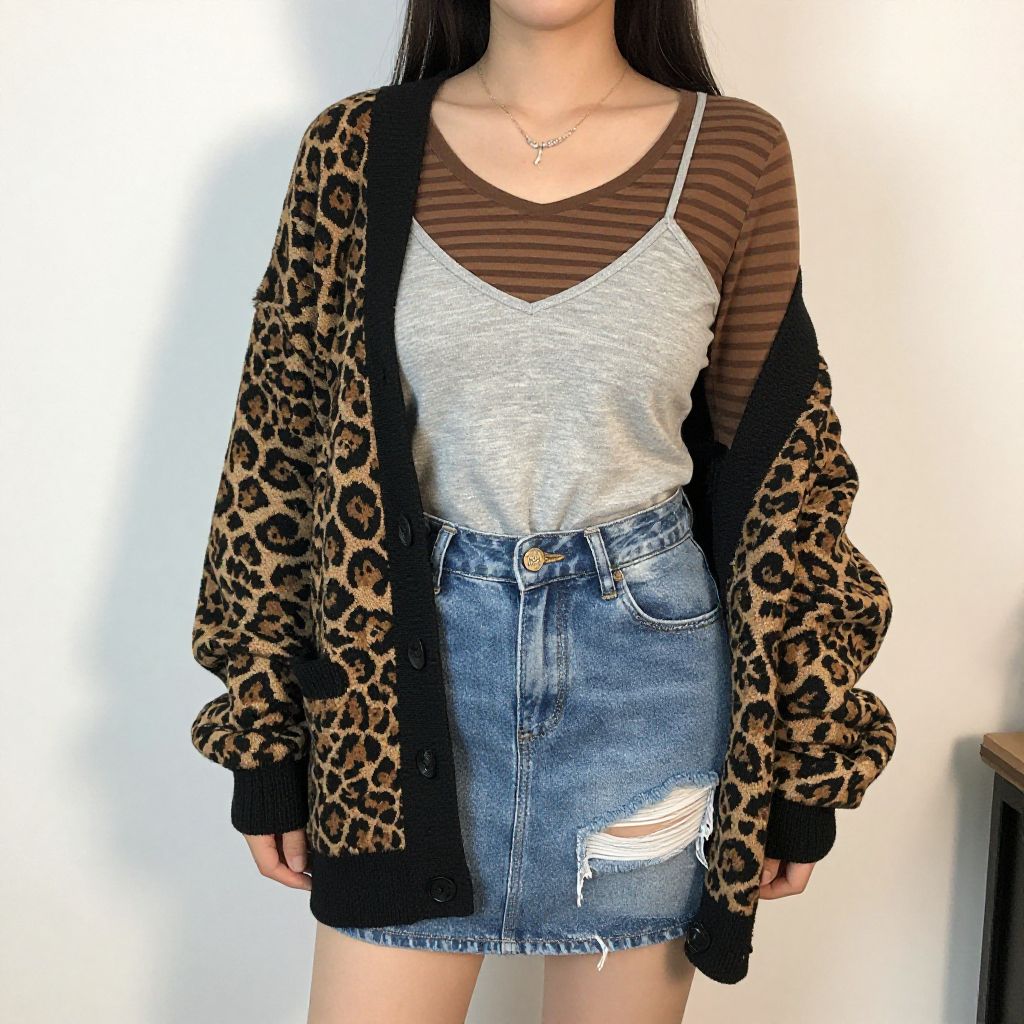 "Woman, casual streetwear, oversized cardigan with leopard print, black and brown, v-neck, long sleeve, distressed denim mini skirt, layered tops with a grey camisole over a brown striped long sleeve t-shirt, delicate silver necklace, white background with soft shadow, indoor setting.. Sexy. Pretty face and beаutiful eyes. Big breasts."