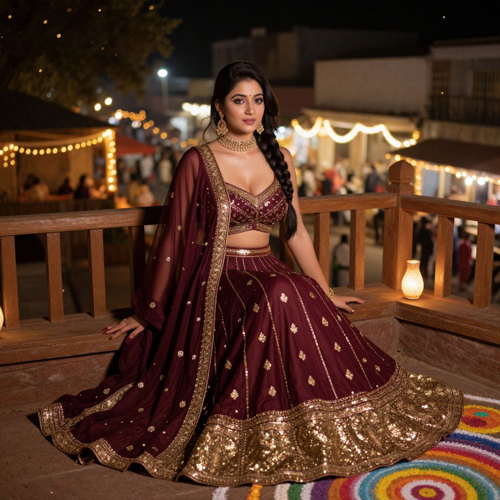A stylish woman in a modern Diwali costume outfit, wearing a deep maroon and gold lehenga with a sheer blouse and chunni, sitting on a wooden balcony overlooking a night market; her long black hair is tied in a braid, face illuminated by soft golden light from festive lamps, surrounded by the warmth of fireflies and colorful rangoli patterns on the ground. The woman has big breasts and cute face