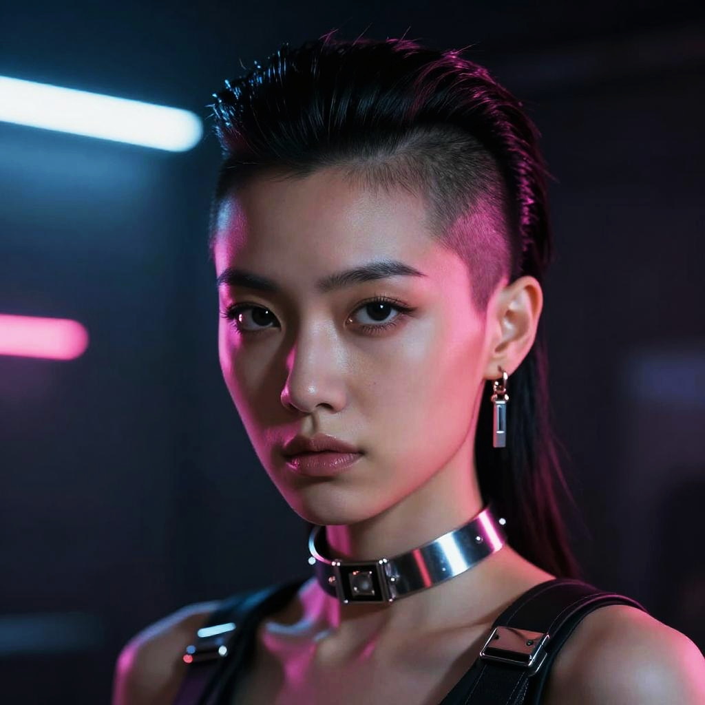 Portrait of a woman with a shaved mullet, futuristic cyberpunk style, neon lights reflecting on metallic accessories, intense gaze, dramatic shadows
