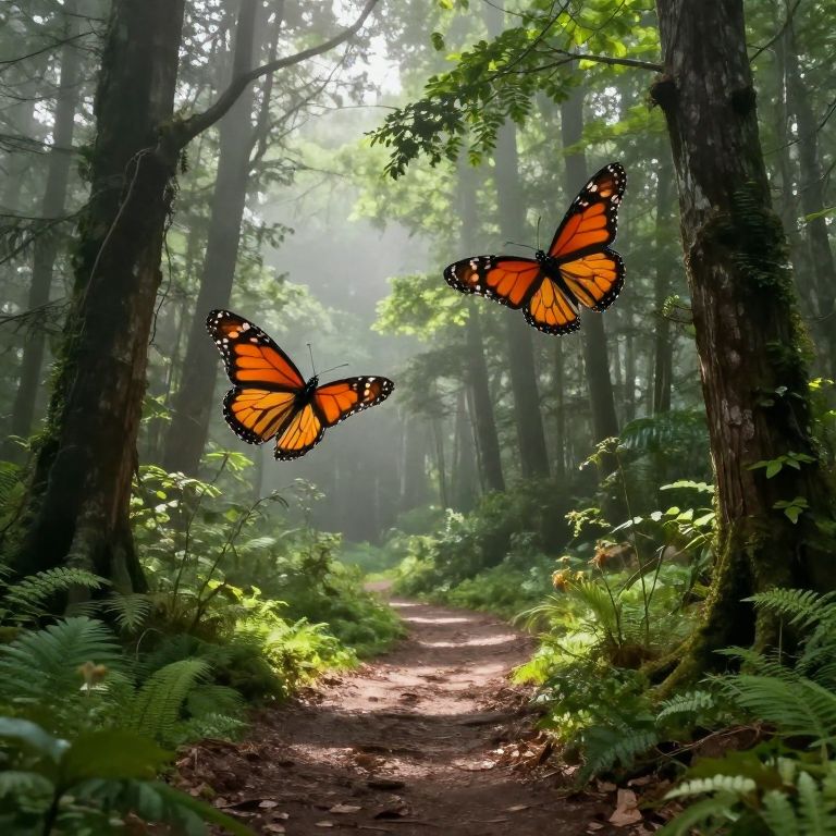 Two vibrant monarch butterflies gracefully flutter through a misty forest clearing, their wings aglow with orange and black patterns as they navigate between towering trees and lush greenery, casting dappled sunlight onto a winding dirt path below.