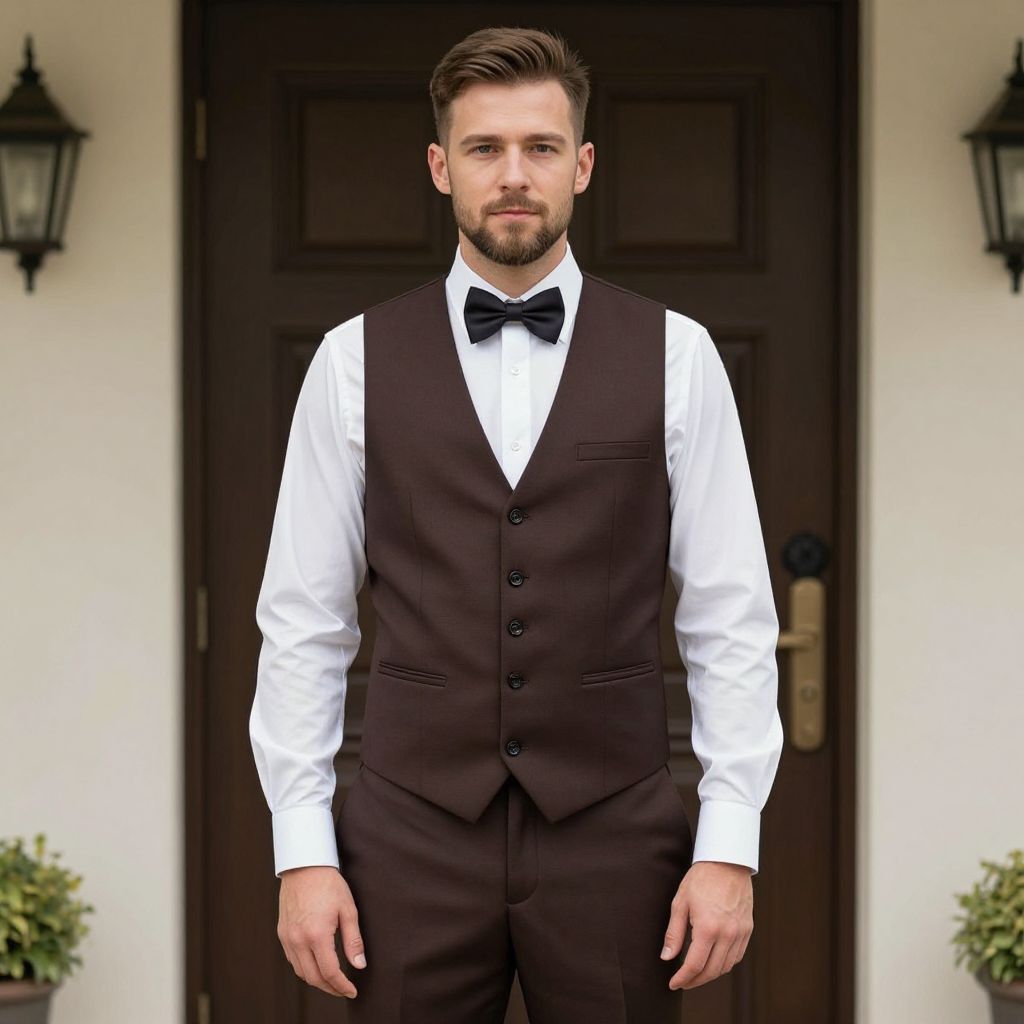 Smart Casual Wedding Costume, man in a brown vest and bow tie standing in front of a door