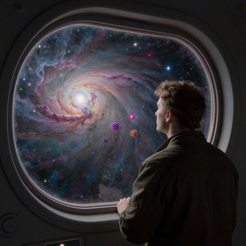 Unsurpassed a man looking out a futuristic window on a spaceship at a nebulae, in the style of Caspar David Friedrich,