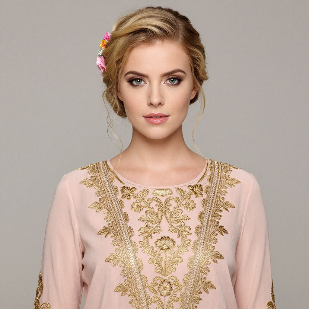 Woman with long brown hair wearing a pink dress with gold embroidery and a black belt.