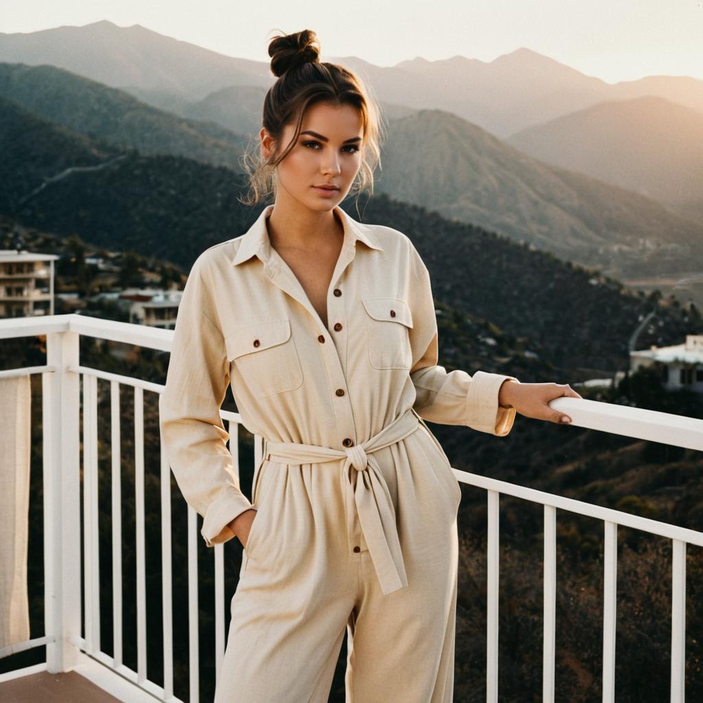 Famous iconic outfit, photorealistic, young woman, standing, mountains in background, sunset light, beige button-up jumpsuit, tied at waist, long sleeves, neutral expression, brown hair in loose bun, fair skin, town below, white balcony, natural light, outdoor setting, casual style, model-like appearance