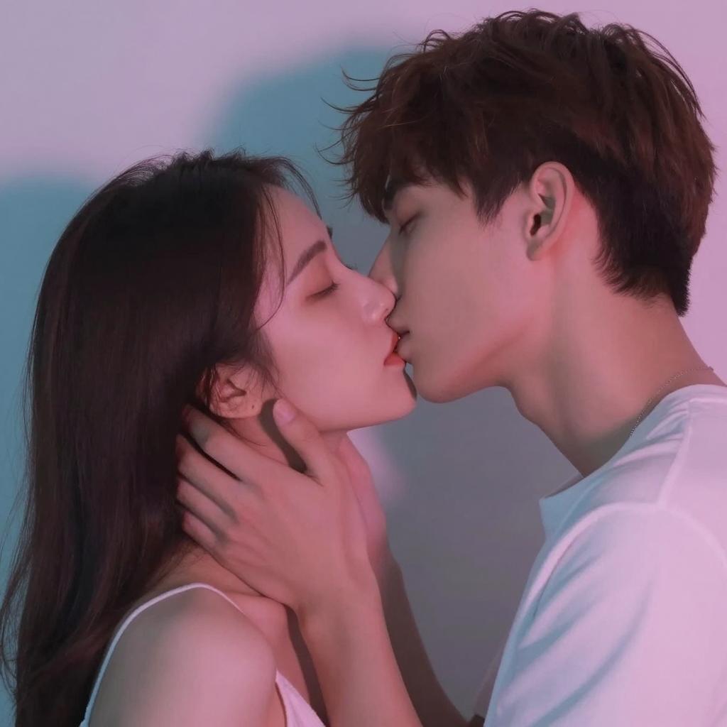 Portrait of a young Asian couple sharing a tender kiss. The male gently holds the female's head with both hands. Both have closed eyes, expressing intimacy. The lighting is soft with a pinkish-blue hue, creating a dreamy atmosphere. The female has long dark hair and is wearing a white sleeveless top. The male has short brown hair and wears a white shirt. The background is blurred with abstract shapes.