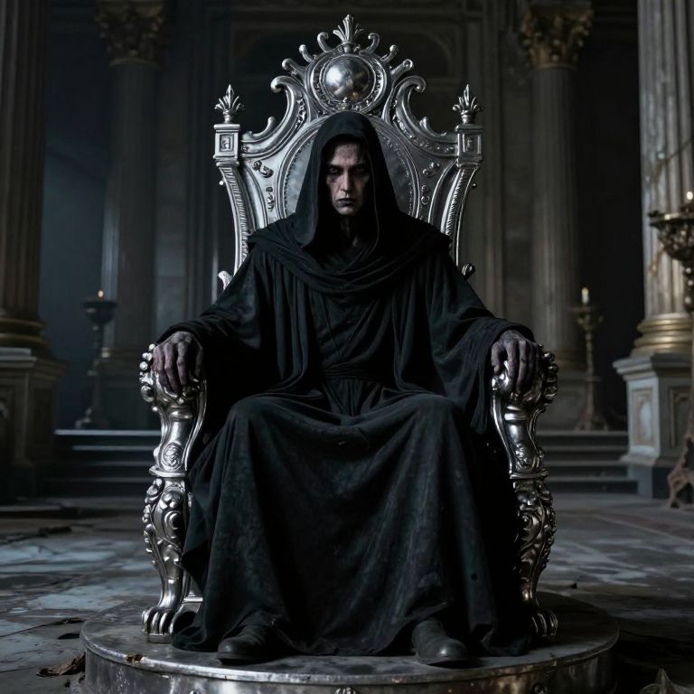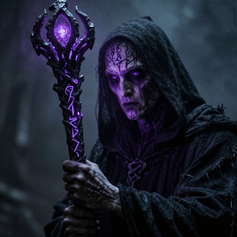 Photograph of a dark, eerie scene featuring a hooded figure with pale, cracked skin and glowing purple eyes. The figure is holding a glowing, intricately designed staff with purple runes and a bright, pulsating orb at the top. The hood casts shadows over their face, enhancing the mysterious and sinister atmosphere. The background is blurred, filled with dark, misty blue tones, adding to the ominous setting. The figure's robes are tattered and textured, suggesting a magical or supernatural origin. The overall color palette is dominated by deep blues and purples, creating a chilling, otherworldly effect.