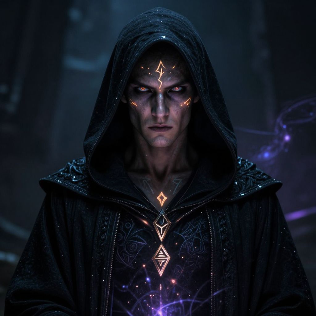 Old national geographic grainy photography, fined grain photo : Imagine a close-up of an eldritch wizard, his face partially obscured by shadows, his void staff held close to his chest, The staff, carved from dark, otherworldly stone, is etched with pulsating purple runes that seem to drain the light around them, His eyes are dark voids, with faint purple light flickering within, and his skin is marked with shifting, cursed symbols that seem to crawl across his flesh, as though alive, These cursed markings are linked to the dark powers he wields, binding him to the eldritch forces, His robe is made of shadowy fabric that moves and shifts as if it has a life of its own, The background is a swirling mist of darkness, with the purple glow of his staff casting an eerie light on his cursed face, enhancing the sense of deep, forbidden power