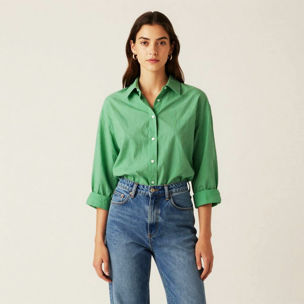 Woman Lime, woman in a green shirt and jeans standing in front of a wall