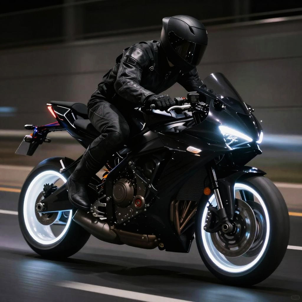 A high-tech, black motorcycle with glowing white LED lights on the wheels and front fairing is captured in a dynamic, low-light setting. The rider, clad in a sleek, black, full-body suit, leans forward aggressively, creating a sense of motion and speed. The background is dark, emphasizing the illuminated elements of the motorcycle and rider. The image has a futuristic, cyberpunk vibe.