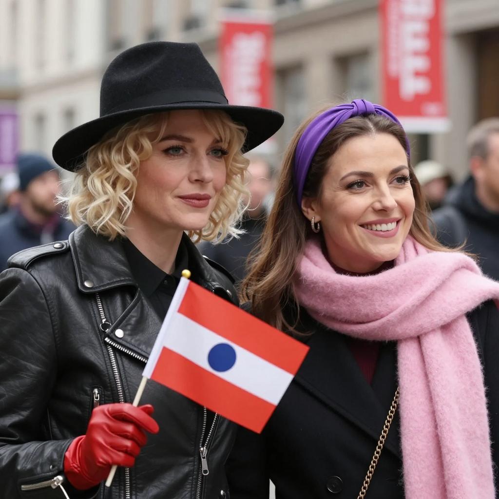 Two women standing behind a store window, both waving with hands raised. The blonde woman on the left has long hair, light skin, and wears a colorful patterned coat with a furry white collar. The brunette woman on the right has short hair, light skin, and wears a green coat with a dark scarf. Both have intense expressions. Background includes blurred storefronts. Glass window frame in foreground.