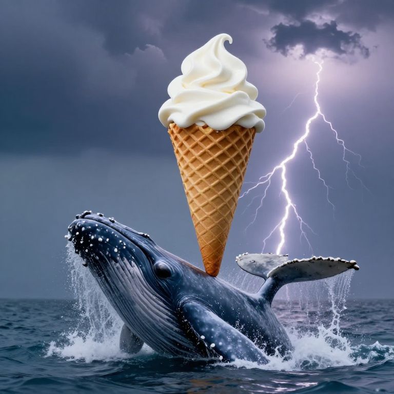 Whale breaches gracefully through stormy waters, balancing a giant waffle ice cream cone topped with fluffy white cream against a backdrop of lightning bolts.