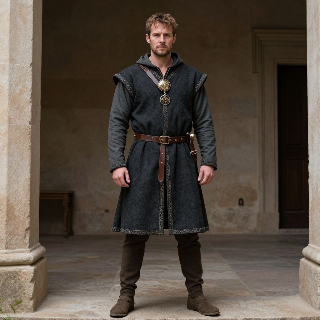 Photograph of a bearded Caucasian man with light brown hair, standing in a dimly lit, stone-walled corridor. He wears a dark, medieval-style tunic with silver trim, a brown leather belt with a metal buckle, and brown boots. The tunic is fastened with a large, ornate brooch at the chest. He stands confidently with his hands by his sides, framed by stone pillars. The background includes a faded, textured wall and a dark doorway to the right. The setting has a historical, rustic ambiance.
