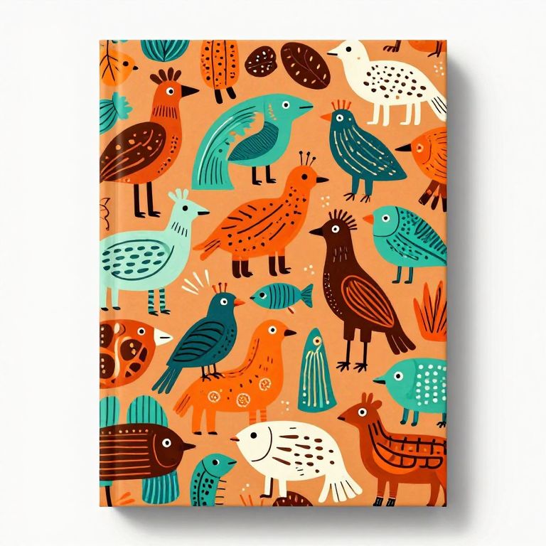 The book cover design features a vibrant, flat animal pattern with a doodle style reminiscent of African art. The composition is densely packed with various animals, including birds, fish, and other creatures, all rendered in a playful, cartoonish manner. The color palette is rich and varied, with shades of orange, teal, brown, and white creating a warm and lively atmosphere. The animals are arranged in a seemingly random yet harmonious manner, with some elements overlapping and others standing out due to their size and placement. The overall design is dynamic and engaging, with a strong sense of depth and layering, as if the animals are emerging from the cover itself. The interplay of colors and shapes creates a visually stimulating experience, inviting the viewer to explore the intricate details and relationships between the different elements.