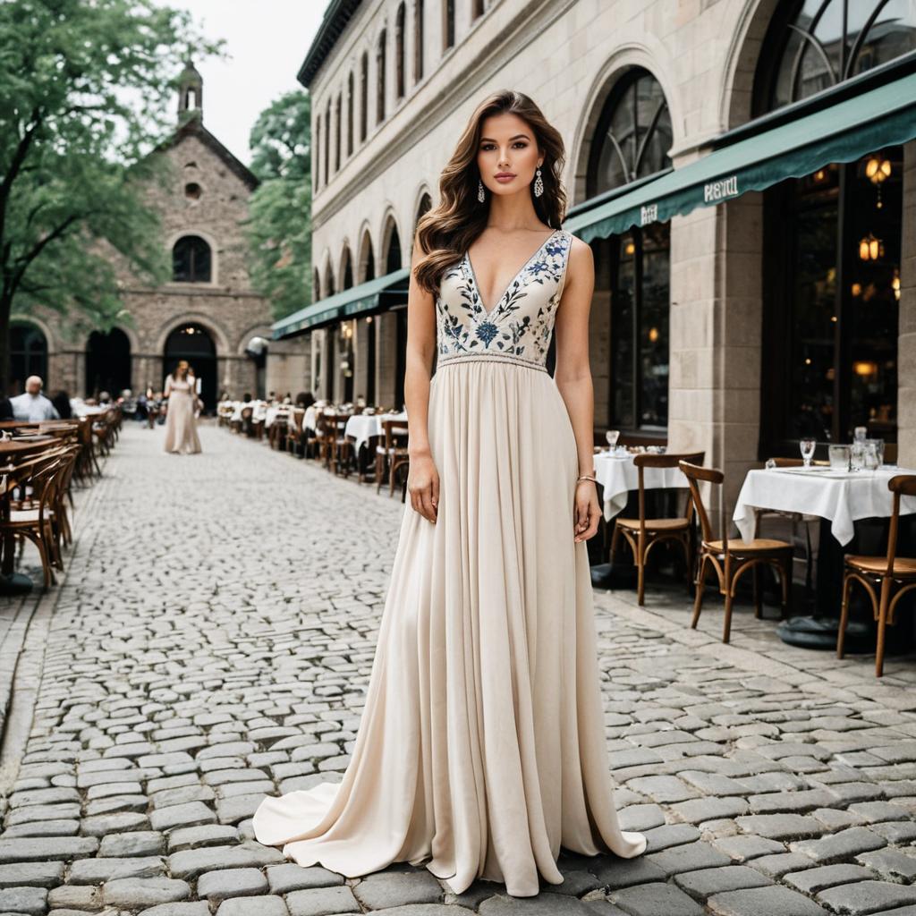 Fancy long gown, photograph of a young woman standing on a cobblestone street, wearing a sleeveless, beige, floor-length gown with delicate floral embroidery, deep V-neckline, long wavy brown hair, silver drop earrings, neutral makeup, background of trees, historic buildings with arched windows, outdoor café with people sitting at tables, daytime, soft natural light, elegant and sophisticated style, fashion photograph, cityscape, fashionable attire, confident pose