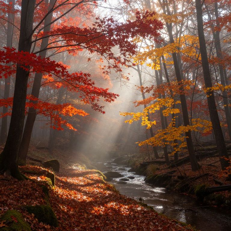 A whimsical clock tower stands serenely amidst a vibrant autumn forest, its pendulum casting a glowing red light that seems to pulse in harmony with the golden leaves and the tranquil stream below, where rocks and flowers blend seamlessly with the timeless beauty of the scene.
