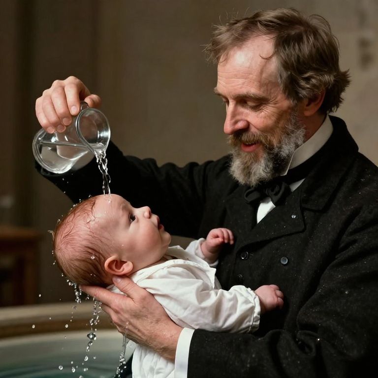 Wrinkles realistic photo of Charles Spurgeon baptizing a baby. He is pouring water over the baby’s head, smiling at him. High resolution, best quality.,