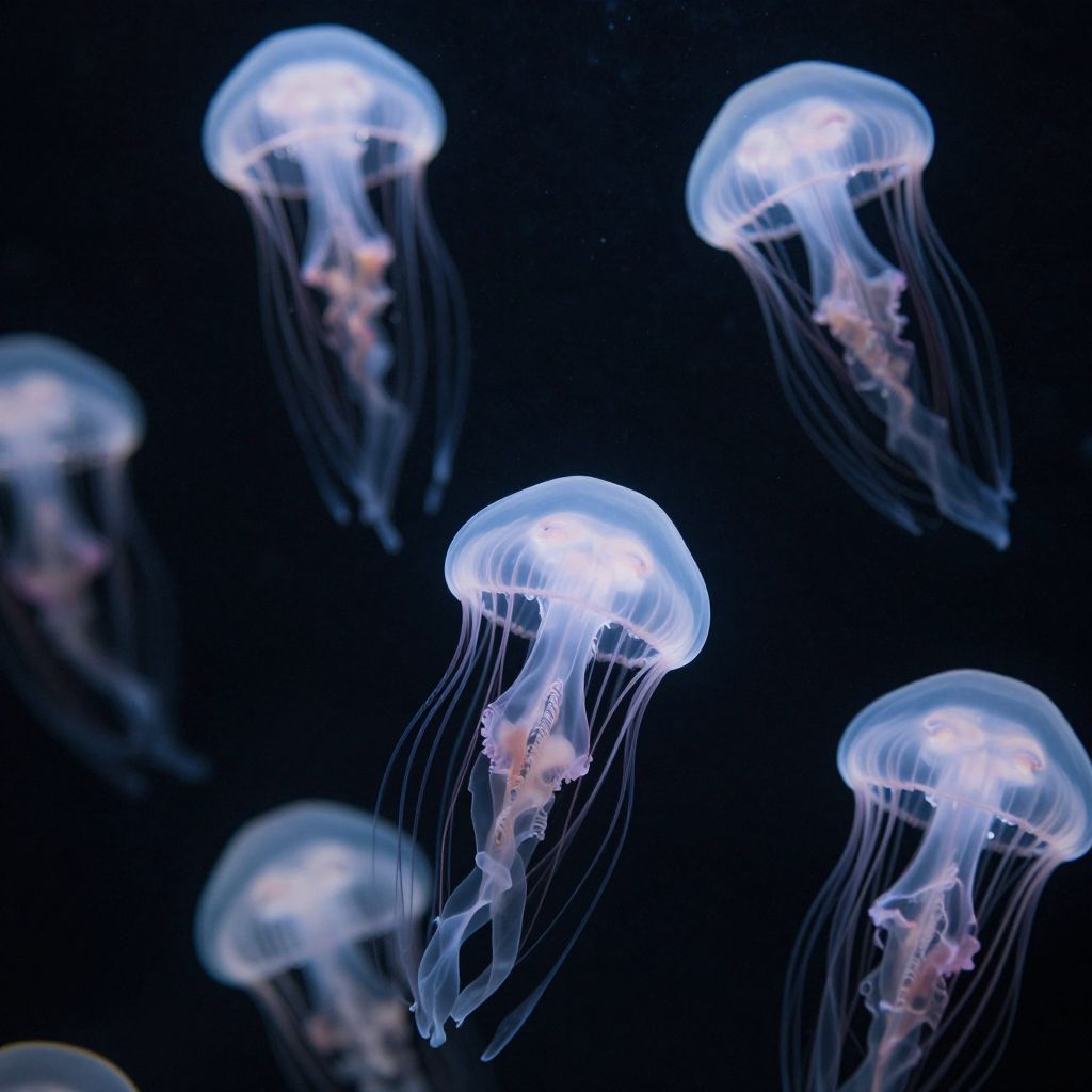 Photograph of six translucent jellyfish with glowing white bell-shaped tops and trailing pinkish tentacles, floating in a dark blue underwater setting. The jellyfish are evenly spaced, with their ethereal, luminescent light casting a soft glow against the dark background. The image captures the delicate, almost ghostly beauty of the jellyfish, highlighting their graceful, flowing movements and the intricate patterns of their tentacles. The overall texture is smooth and fluid, emphasizing the jellyfish's buoyancy and the serene underwater environment.
