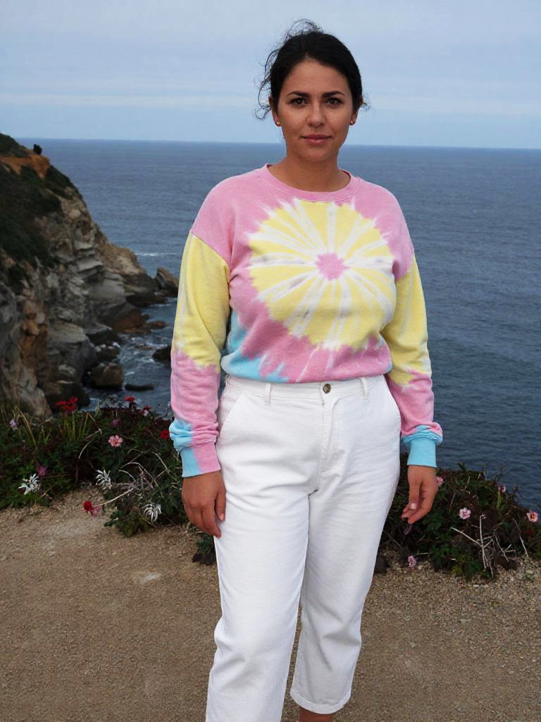 A stocky woman in casual streetwear, wearing a pastel tie-dye sweatshirt and white cropped chino pants, stands on a coastal cliffside path. The visual style is reminiscent of a Holga camera, capturing the vibrant colors and soft focus of her outfit against the stunning backdrop of the ocean. Sexy. Pretty face and beаutiful eyes. Big breasts