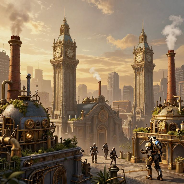 Steampunk city art portraying a grand city center with monumental clock towers and factories, intricate rooftop gardens with pipes and chimneys, steam clouds rising into a golden dusk sky, and people in steam-powered exoskeleton suits moving through the environment.