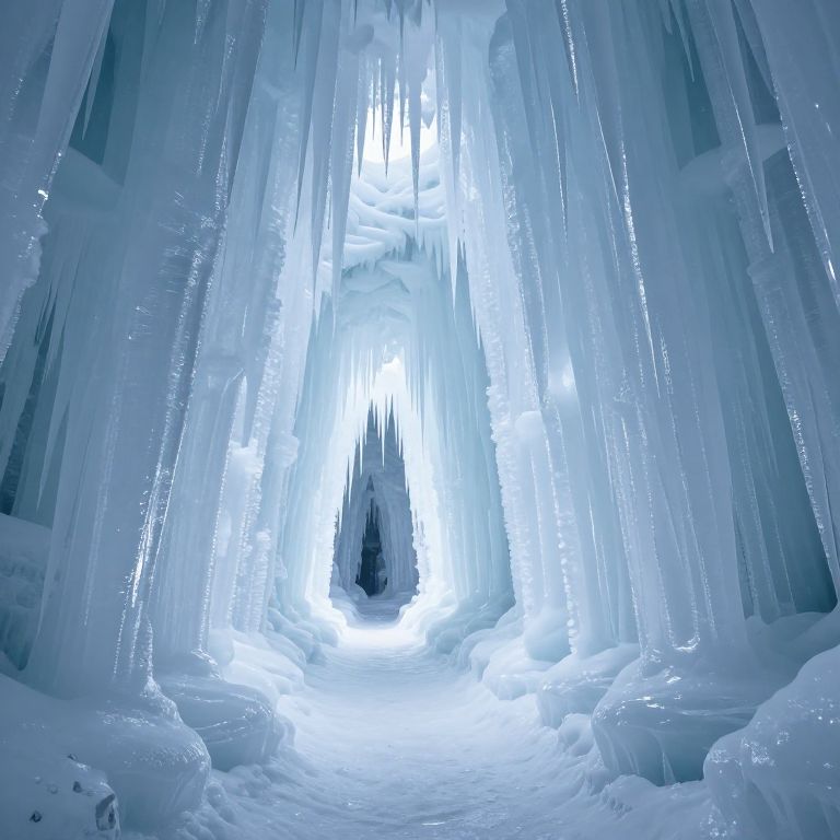 A luminous, icy corridor stretches endlessly into the distance, its walls adorned with cascading icicles that seem to defy gravity, creating a surreal, crystalline cathedral of light and cold.