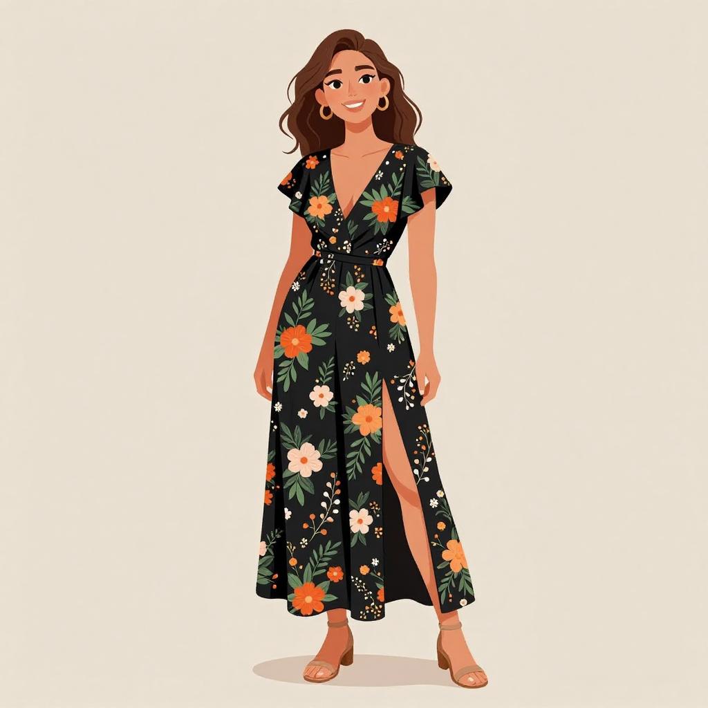 Woman with pretty face and pretty hair. smiling Woman, bohemian style, black floral print maxi dress with a mix of small and large blooms in shades of orange, pink, and green, short flutter sleeves, V-neckline, high-waisted with gathered details, front slit on skirt reaching mid-thigh, soft, lightweight fabric, ankle-strap sandals in a neutral color, studio background with a slightly --sref 1467
