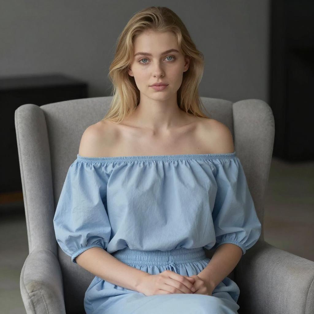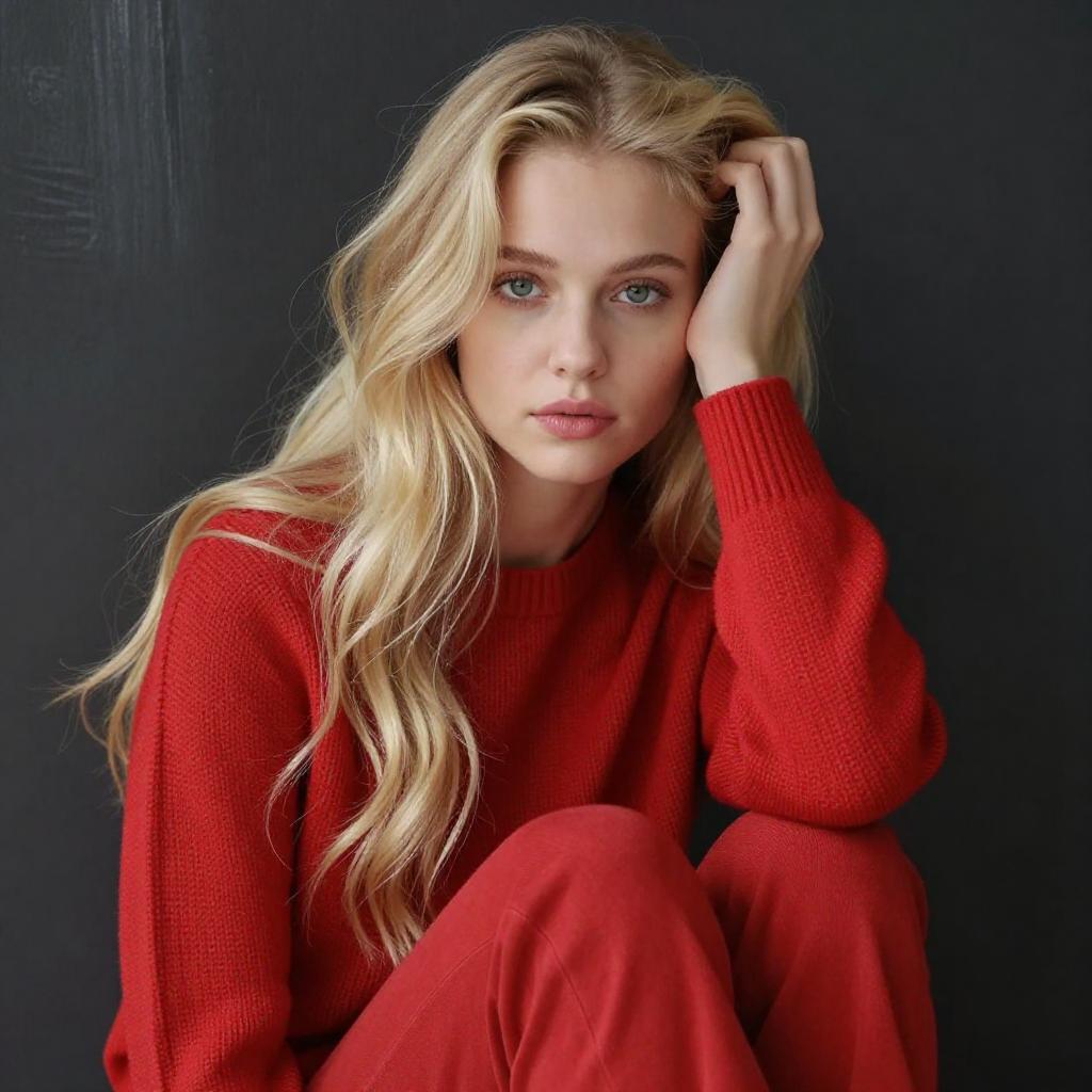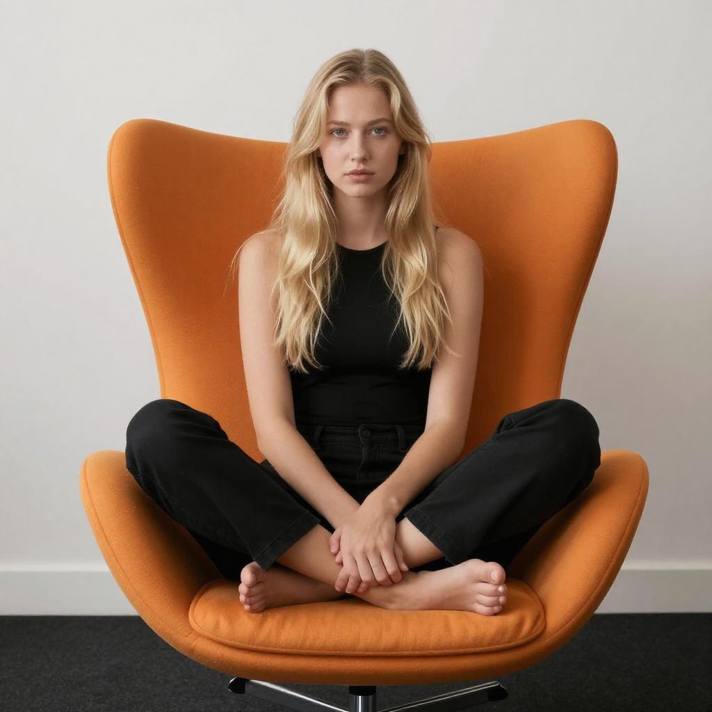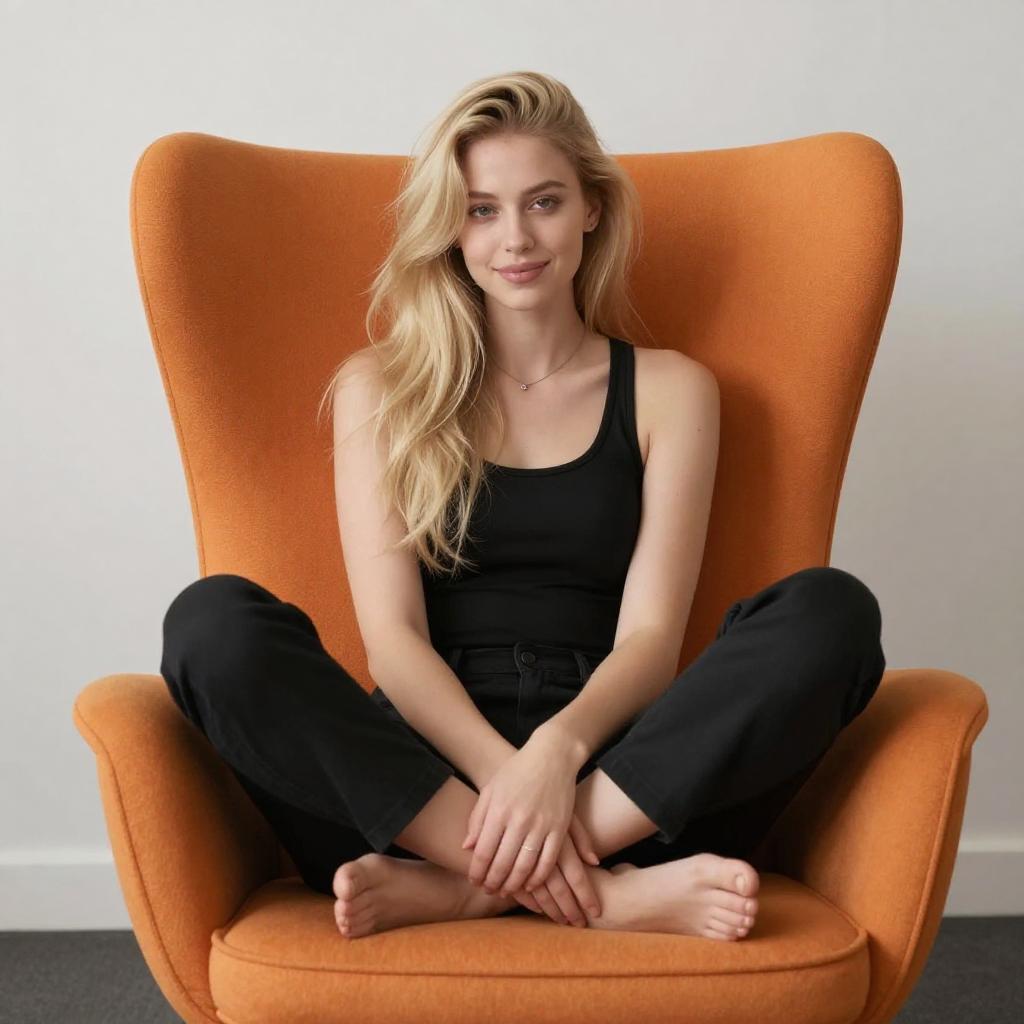 Photograph of a young woman with long blonde hair, fair skin, and blue eyes, sitting cross-legged in a bright orange, modern, wingback chair with a chrome base. She wears a black, sleeveless top and black pants, against a plain white wall and black carpeted floor.