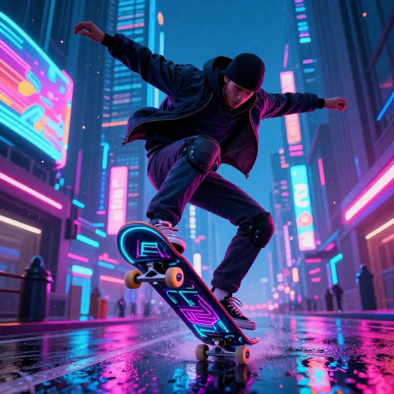 Ollie depicted as a futuristic skateboarder in a neon-lit cyberpunk city, performing an advanced ollie trick with glowing board effects, rainy streets reflecting colorful holograms, bold composition emphasizing speed and technology.