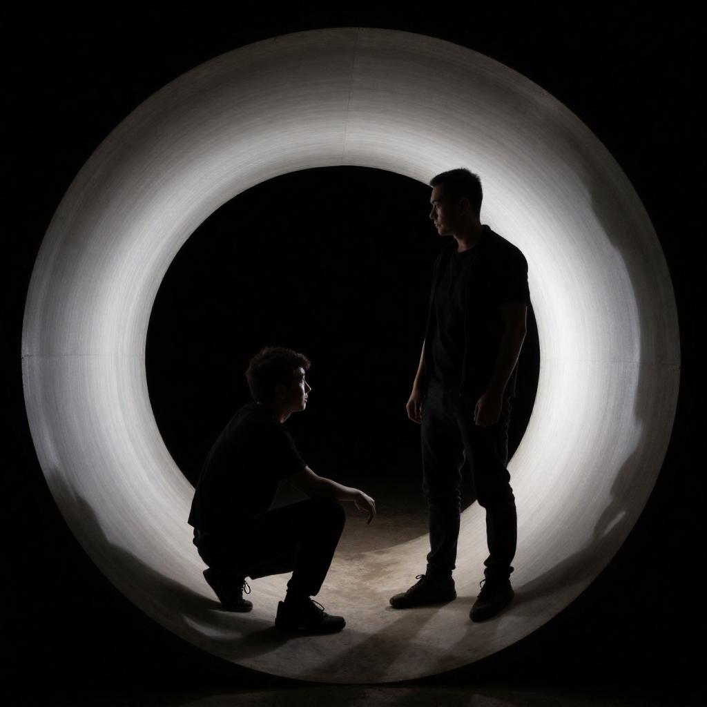 Photograph of a person standing in a dimly lit room viewed through a circular, illuminated tunnel with white LED lights on the left and right. The person is centered, wearing a dark shirt and jeans, with a small bright light in the background. The tunnel's smooth, white surface contrasts with the dark room.