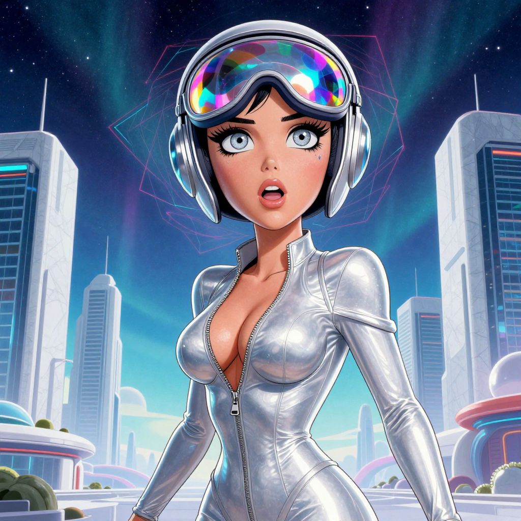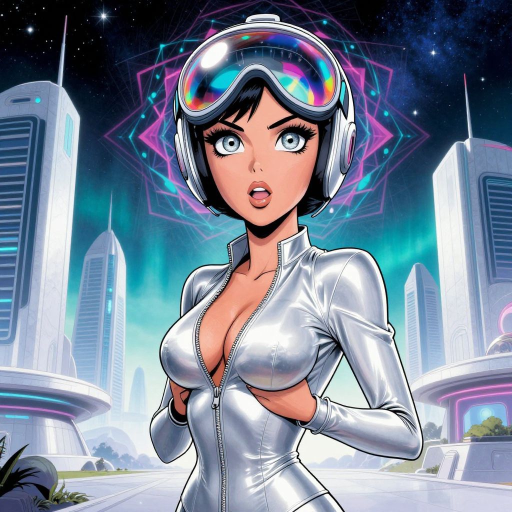 Psycho4rt, aestheticpos3, dynamicpos3, Cinematic, futuristic scene featuring a face-focused and body-focused close-up portrait of a mysterious stunningly beautiful petite slender bombshell female Italian model wearing a tight shiny revealing silver suit, The figure stands in a serene, fantasy-like landscape surrounded by massive modern buildings, under a vast starry night sky, She has beautiful narrow face with flawless sharp model-like facial features and large captivating silver-blue eyes, surrounded by cyan pink purple geometric patterns, evoking an otherworldly aura, Her face shows and expression of awe and wonder, she has long eyelashes and elaborate makeup, long elaborate eyeliner that extends beyond her eyes, smoked eye mascara, holographic rainbow lights of her sexy futuristic helmet visor reflect on her detailed perfect skin and shiny tight suit, she has a fit slender body and an impossibly small waist, microwaist, perfect round bulging breasts, The figure stands poised adjusting a zipper at her bust, revealing cleavage, In the distant background, tall futuristic white marble and glass buildings and skyscrapers rise softly into a horizon with a gentle, ethereal glow, aurora in the sky, enhancing the enigmatic atmosphere, comicsource, western comics, heavy lines, high contrast, cinematic, vintage neon, colorful fractal