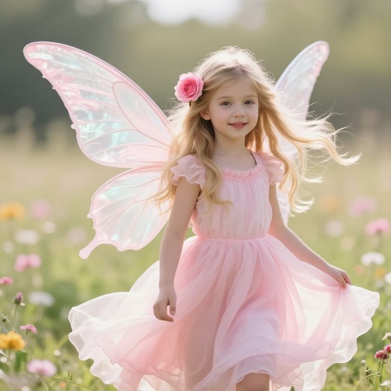 A beautiful young girl with long flowing blonde hair and soft, warm brown eyes stands in a sun-dappled meadow, her butterfly wings extending gracefully from her back. The wings are vibrant and delicate, shimmering with iridescent colors like turquoise, pink, and gold, blending seamlessly with her form. She wears a light, flowing white dress with floral patterns, and the wind gently lifts her hair and the wings as she smiles warmly at the viewer. The background features a peaceful landscape with blooming flowers, a distant hill, and a blue sky with soft clouds.