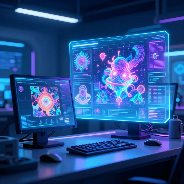 Photograph of a modern, neon-lit computer desk at night. Two glowing monitors display vibrant, blue and pink, digital art resembling abstract cosmic designs with spheres, suns, and swirling lines. The larger monitor is on the right, and a smaller one is on the left. Both screens have a futuristic, holographic appearance. The desk has a black keyboard, a white cup on the far right, and a mouse on the left. The background is dimly lit with blue and purple hues, creating a cyberpunk atmosphere. Overhead lights cast a cool blue glow. The image has a sharp, high-contrast style.