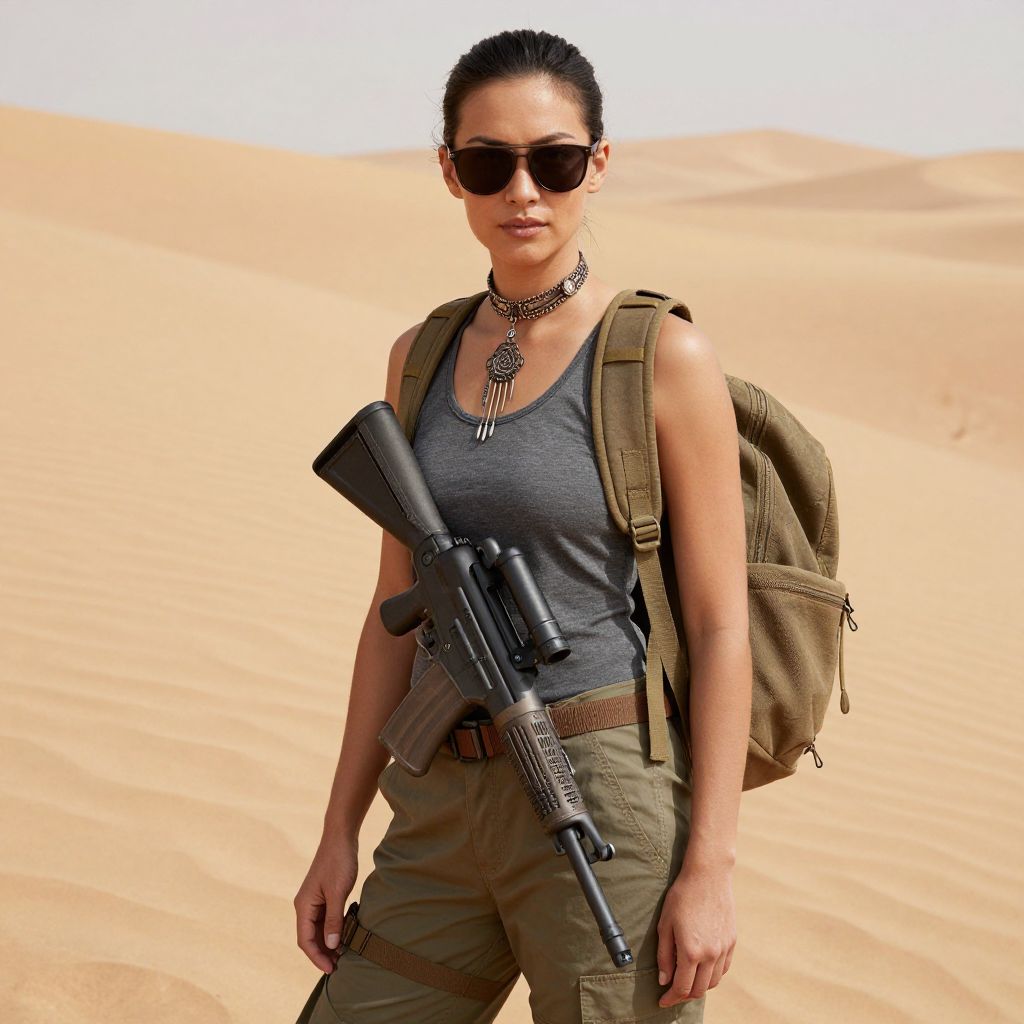 Boldly styled woman stands in a desert landscape, donning dark sunglasses, a tribal choker necklace, and a backpack equipped with a mounted firearm, exuding a rugged and adventurous aesthetic.