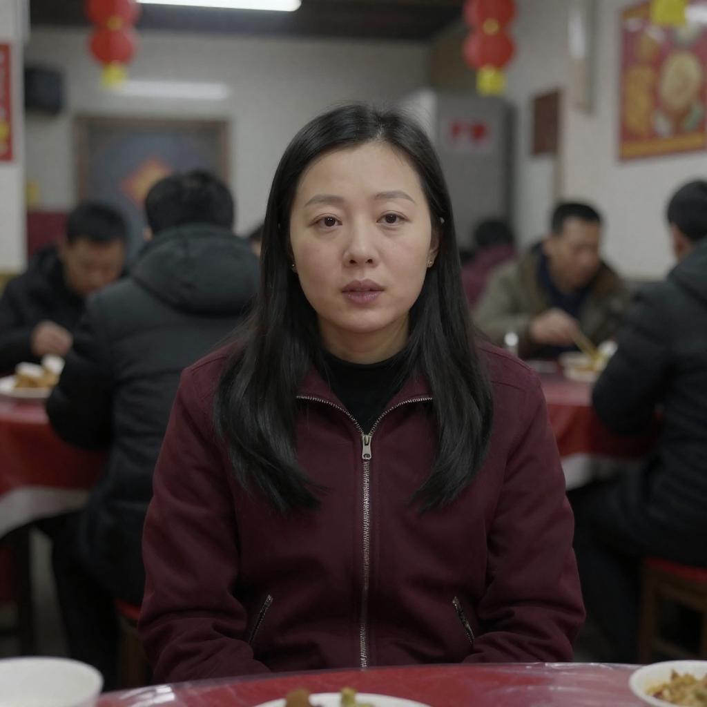 Photograph of an Asian woman with long black hair, wearing a maroon jacket, sitting in a dimly lit, cluttered restaurant. She is centered in the foreground, with blurred patrons and red decorations in the background. A red tablecloth partially covers the bottom of the image.
