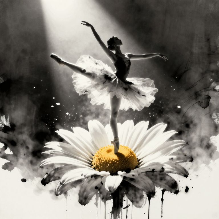 Graceful ballerina in mid-pirouette atop a large daisy flower, illuminated by a single spotlight, her dress flowing like petals around her, faint dust particles visible in the air bold ink drips cascading down, ink and brushstroke dismrt style, ink and brushstroke dismrt style