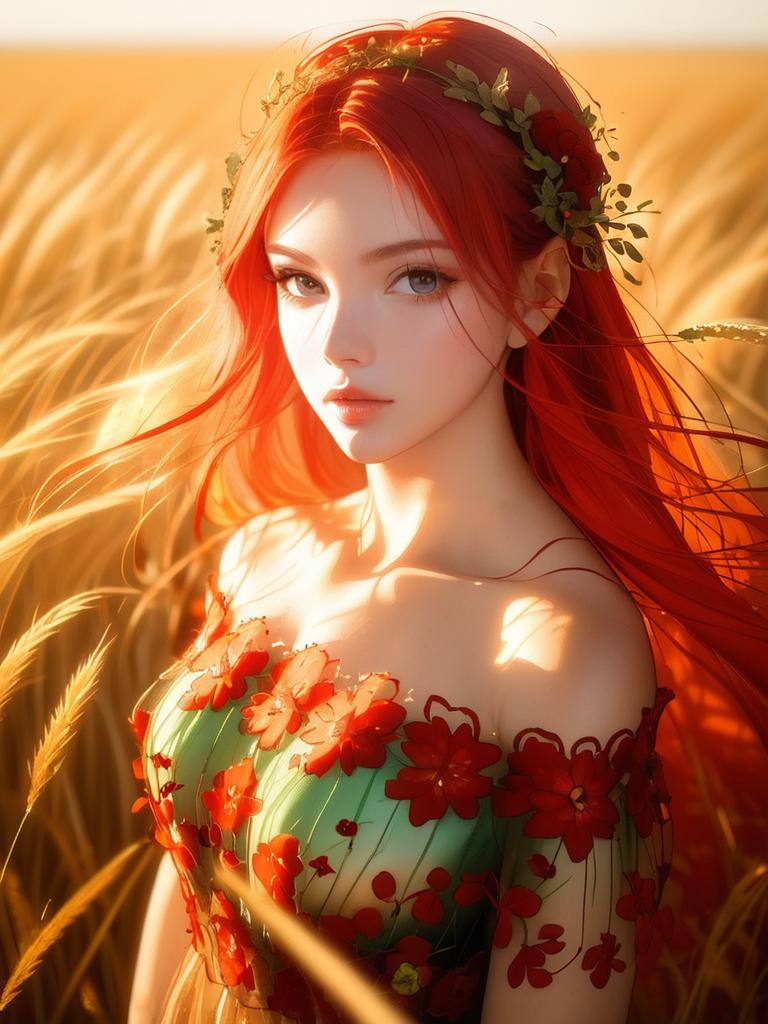 A close-up portrait of a beautiful woman with vibrant red hair and green eyes, wearing an intricate sheer off-shoulder dress with floral details, standing in a sunlit golden wheat field during late afternoon, soft natural warm lighting illuminating her delicate features and flowing hair, cinematic glow effect emphasizing warm tones and fine skin details
