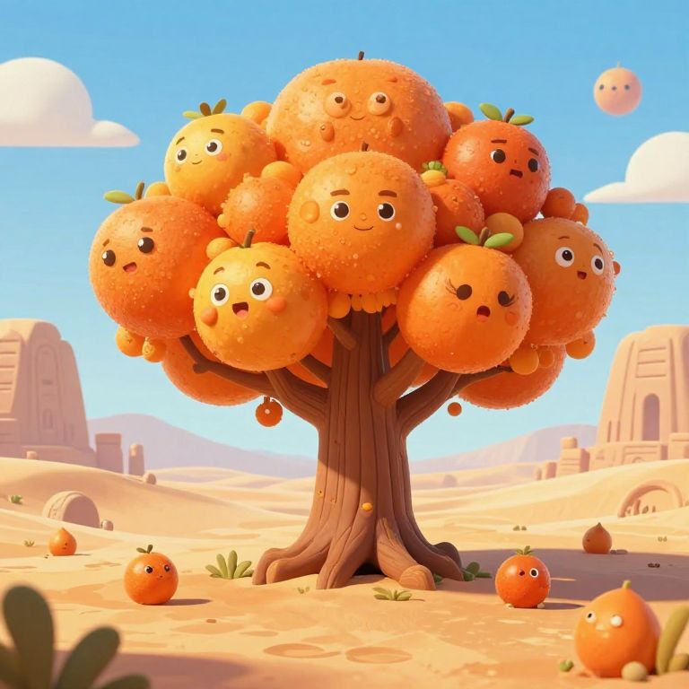 CGI cartoon of a whimsical orange tree with round, smiling fruit faces in a bright desert landscape under a blue sky.