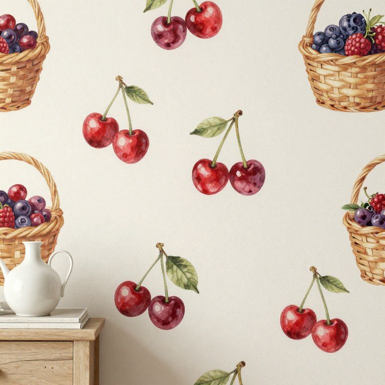 Retro Art Prepasted Berries and Baskets Wallpaper - Cherry