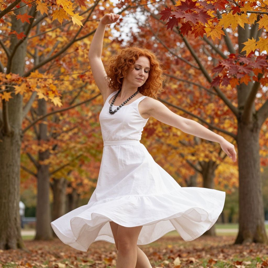 A woman with curly red hair, wearing a white dress and a necklace, dances under maple trees in autumn, rendered in Octane with Enreal Engine.