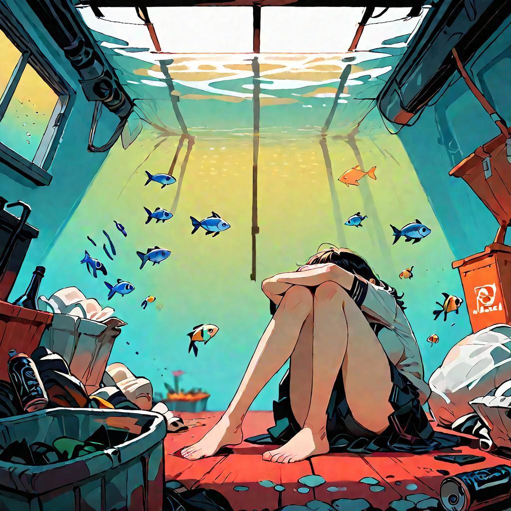 By muk \(monsieur\), score_9, score_8_up, score_7_up, best quality, masterpiece, uncensored, source_animemiyu (tiny evil), 1girl, :o, black thighhighs, blunt bangs, bottle, brown eyes, brown hair, brown sweater, can, casual, door, fan, fire hydrant, grey shorts, industrial, lamp, open mouth, outdoors, raised eyebrows, rust, shoes, short hair, shorts, sitting, sneakers, solo, stairs, surprised, sweater, thighhighs, towel, umbrella, water bottle