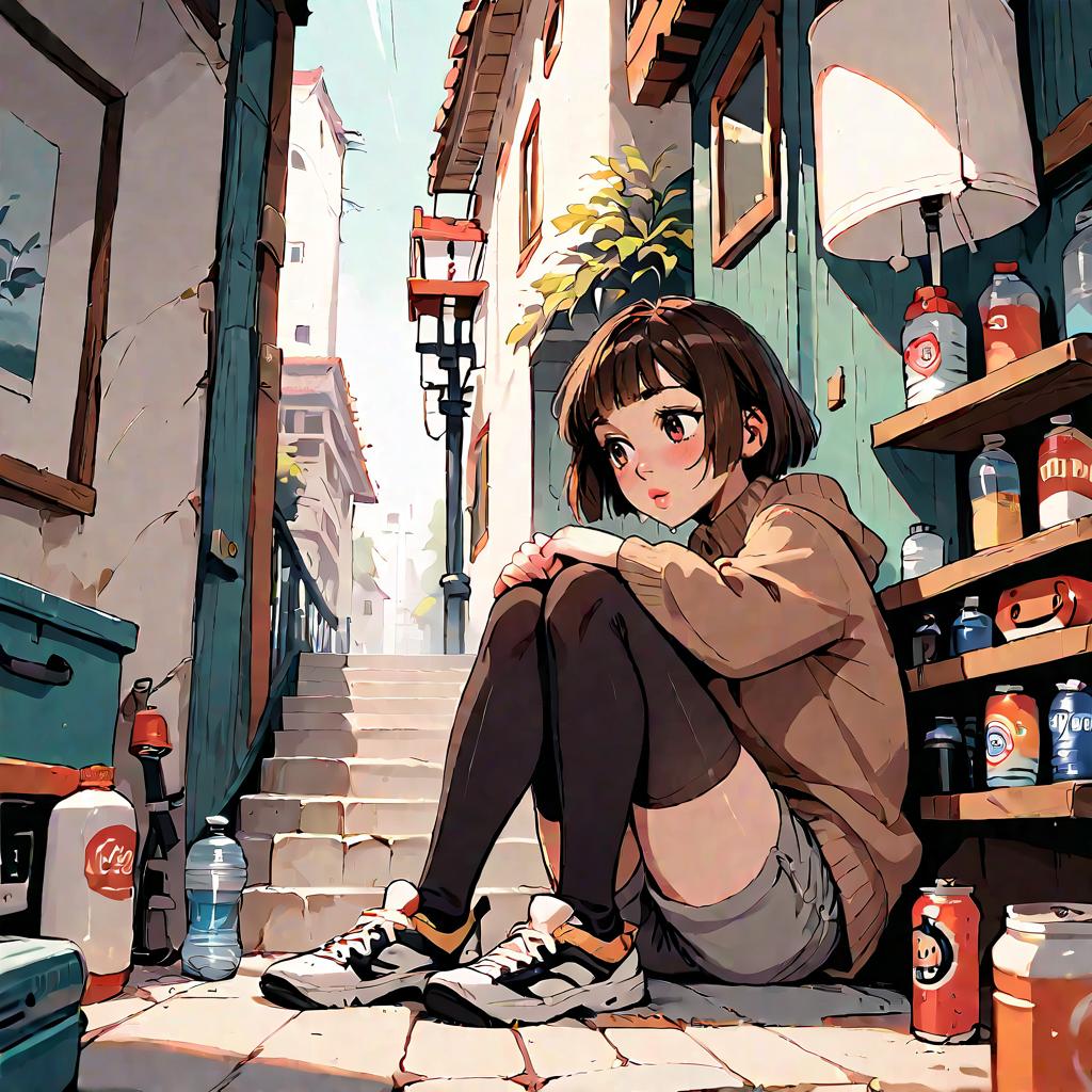 Digital artwork of a young anime girl with short brown hair and blunt bangs sitting on outdoor stone stairs. She wears a brown sweater, grey shorts, black thigh-high socks, and sneakers. The scene features rustic buildings, an open door, various bottles and cans on shelves, and soft natural light creating warm shadows. The girl has a surprised expression with raised eyebrows and an open mouth.