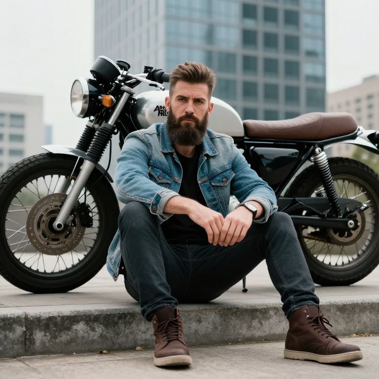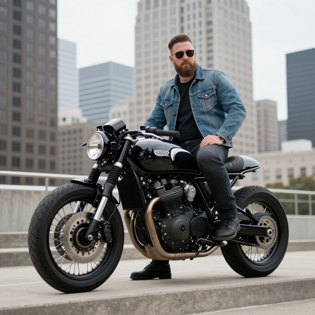 Brutal bearded man in a denim jacket sits confidently atop a sleek, custom-made retro motorcycle, positioned on concrete steps with a backdrop of towering skyscrapers.