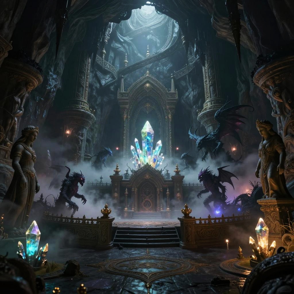 AI dungeon generator showcasing a mystical underworld cavern with glowing crystals, eerie fog, ancient statues, and magical barriers, inhabited by shadowy fantasy creatures, rendered in moody dark fantasy style with rich color contrasts and detailed environment design.